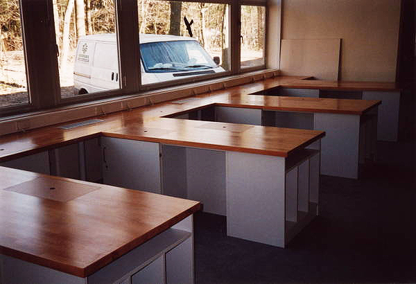 Eine Besonderheit stellt in den Arbeitsräumen für Textiles Werken die Unterbringung der Nähmaschinen dar, sie ist besonders funktional und komfortabel: